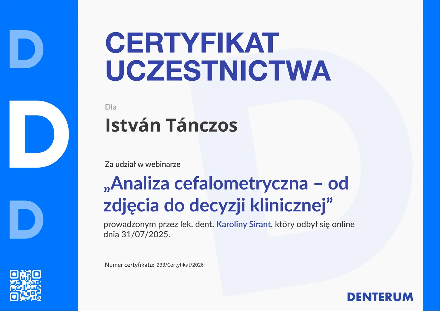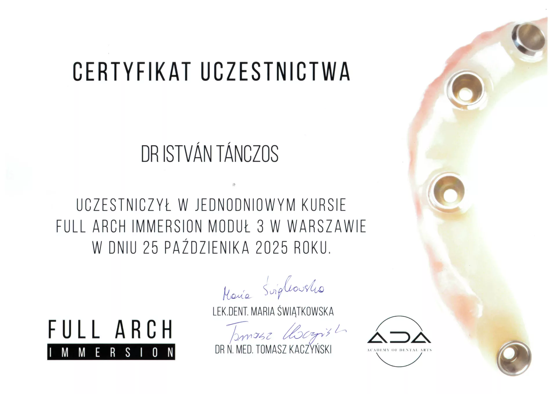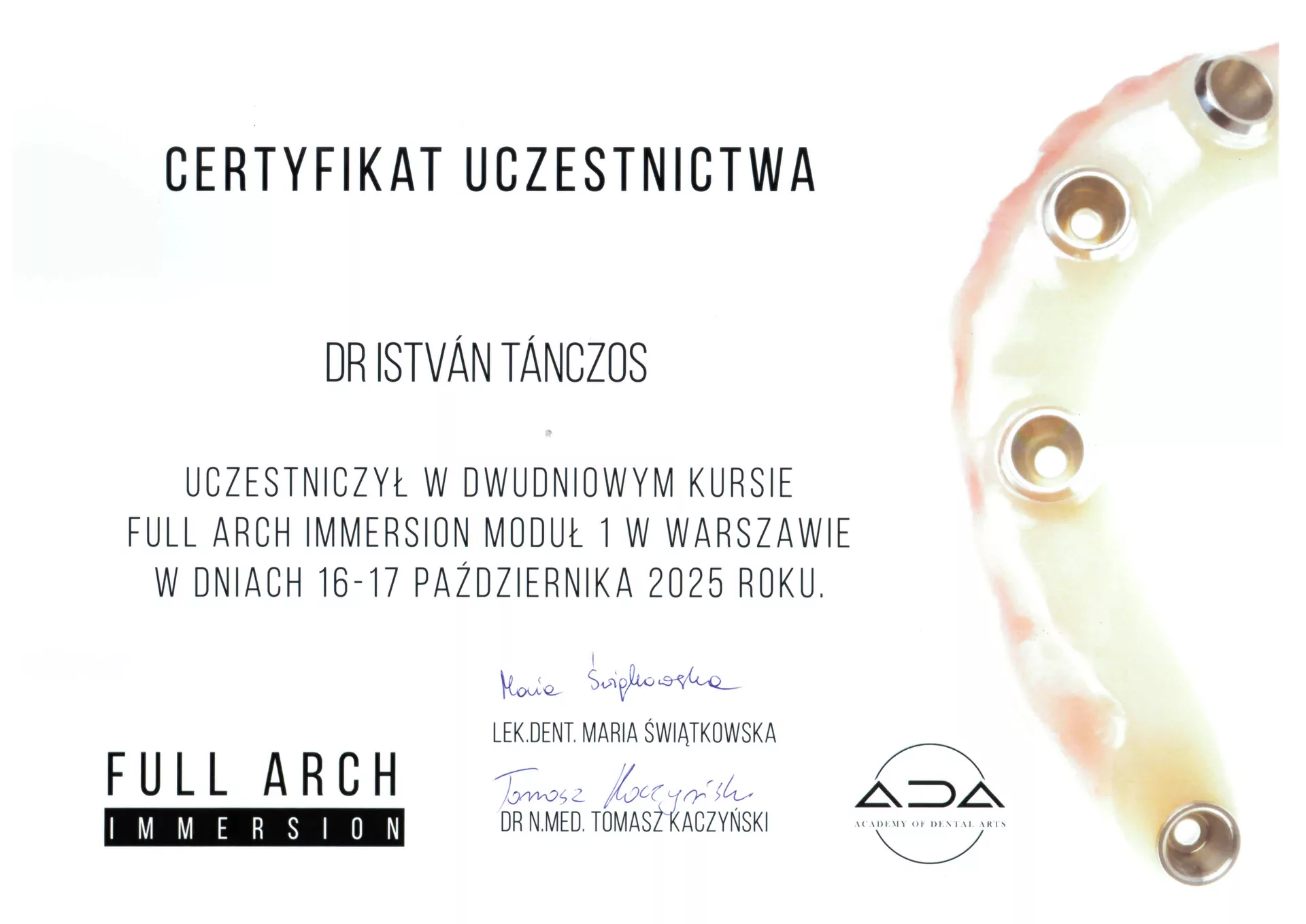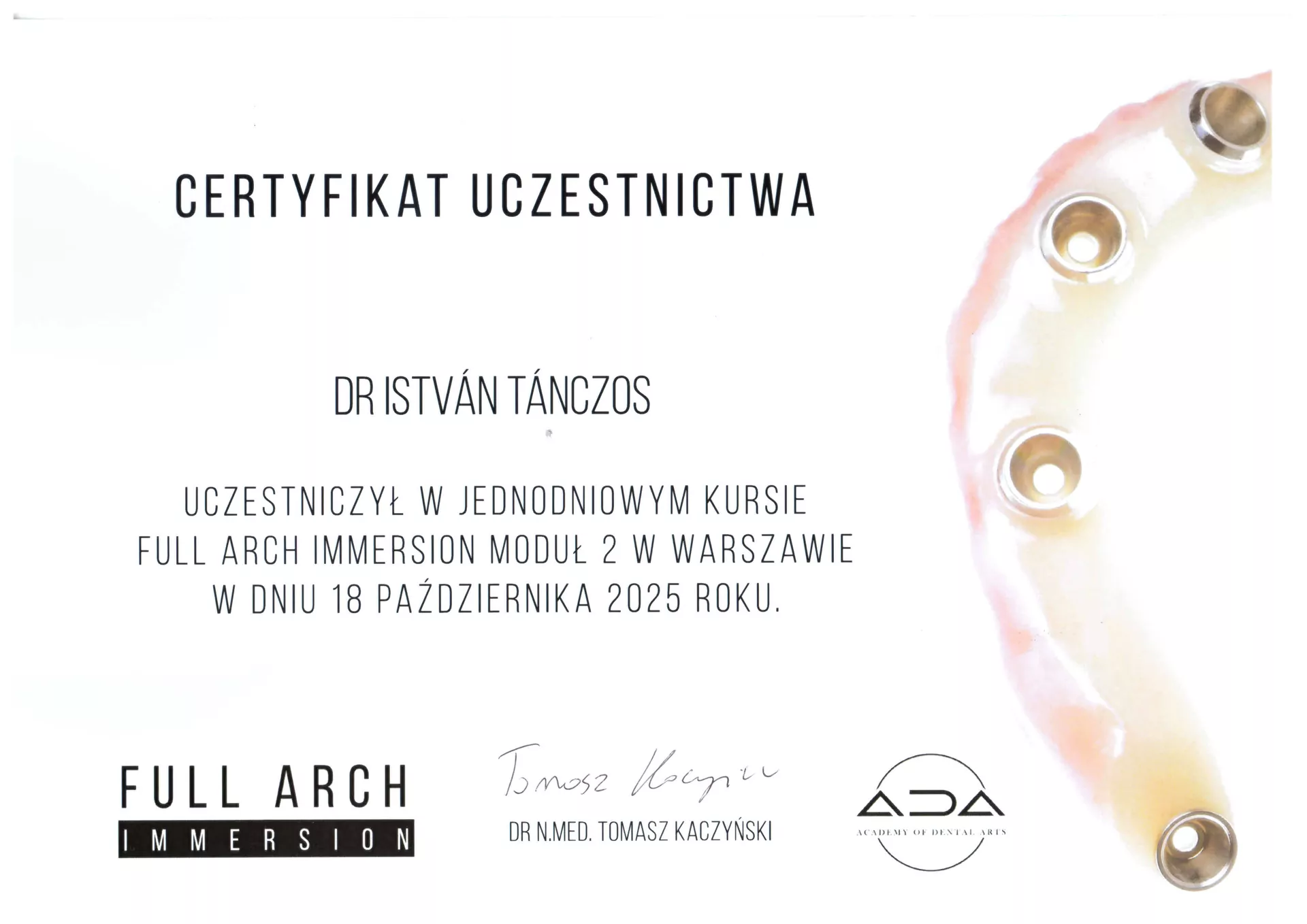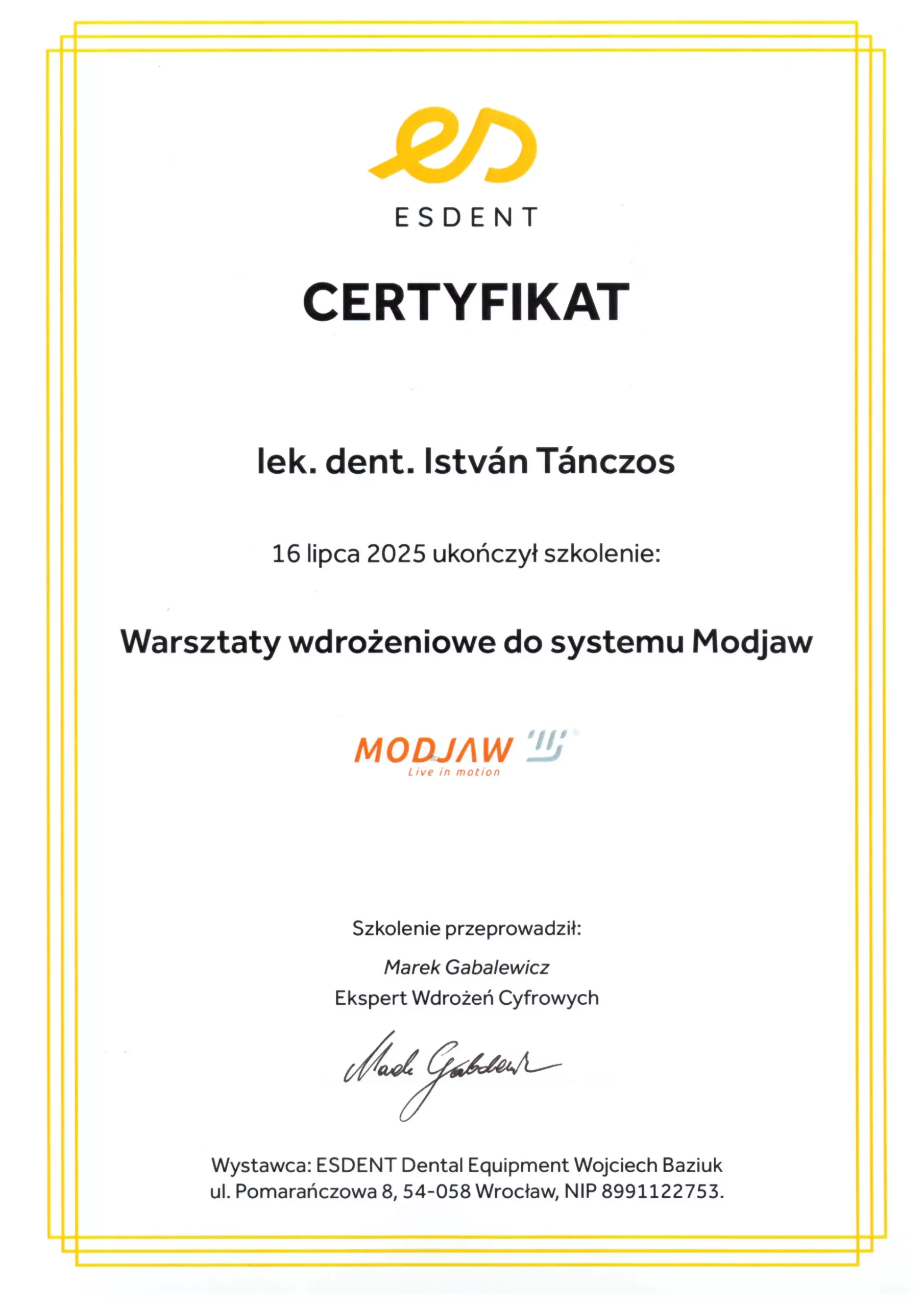 Studia stomatologiczne ukończył w 1992 r. na Wydziale Lekarskim Uniwersytetu im. Komensky’ego w Bratysławie. W 1997 r. zdał egzamin specjalizacyjny 1-wszego stopnia z chirurgii stomatologicznej. Później swoje zainteresowania zawodowe zwrócił w stronę protetyki, implantologii oraz stomatologii estetycznej, która stanowi główne pole jego zainteresowań. W 2009 ukończył Curriculum Implantologiczne na Uniwersytecie im J.W Goethe we Frankfurcie nad Menem. W życiu prywatnym jest szczęśliwym ojcem trójki dzieci. Wolny czas najchętniej spędza na korcie tenisowym, latem na rejsach śródziemnomorskich a zimą na stokach narciarskich. Biegle włada językiem węgierskim, czeskim i słowackim.